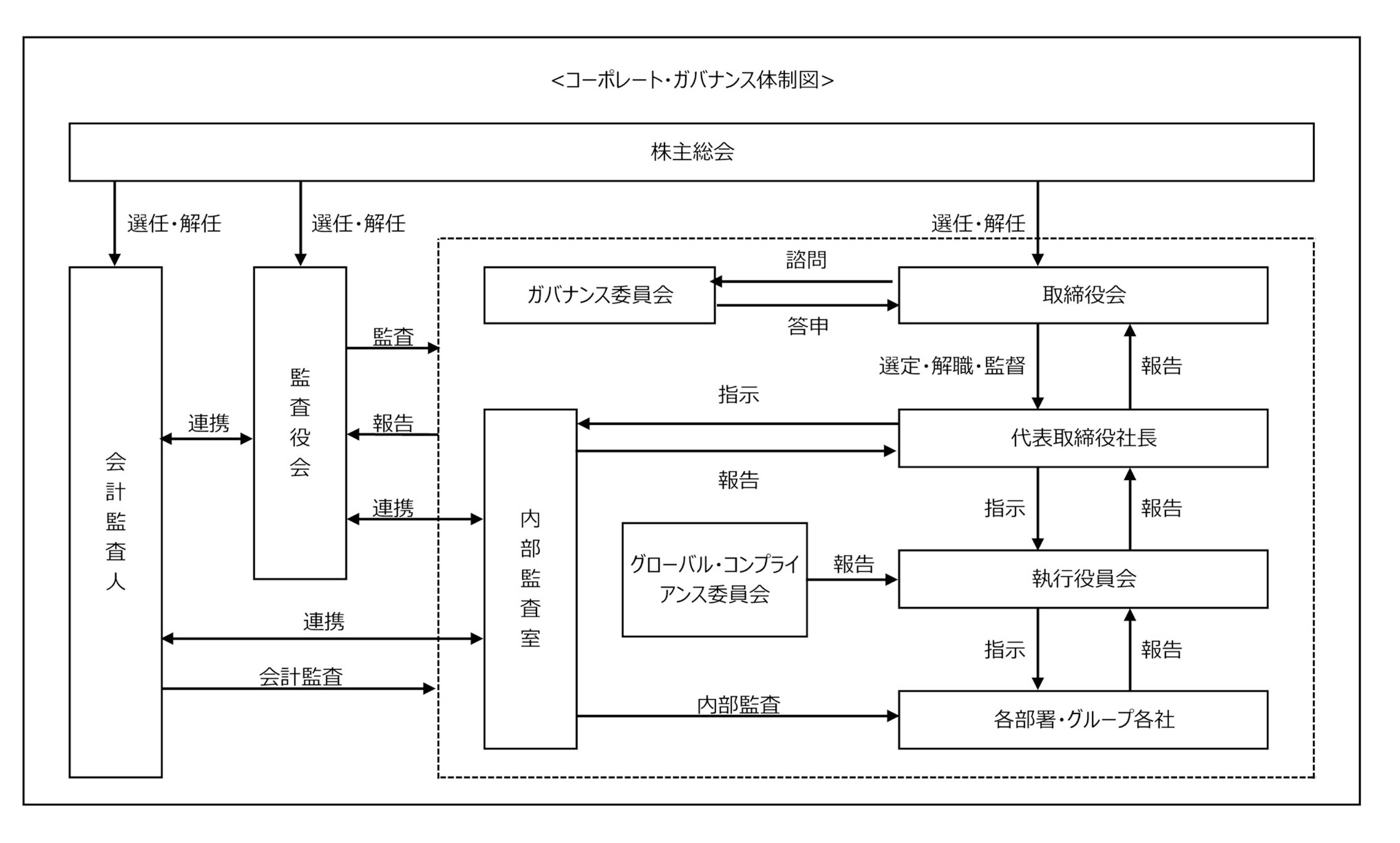 当社は監査役制度を採用しております。会社の機関として会社法に規定する取締役会及び監査役会を設置しており、重要な業務執行の決議、監督並びに監査を行っております。また、その補完機関として執行役員会やグローバル・コンプライアンス委員会を設置しております。